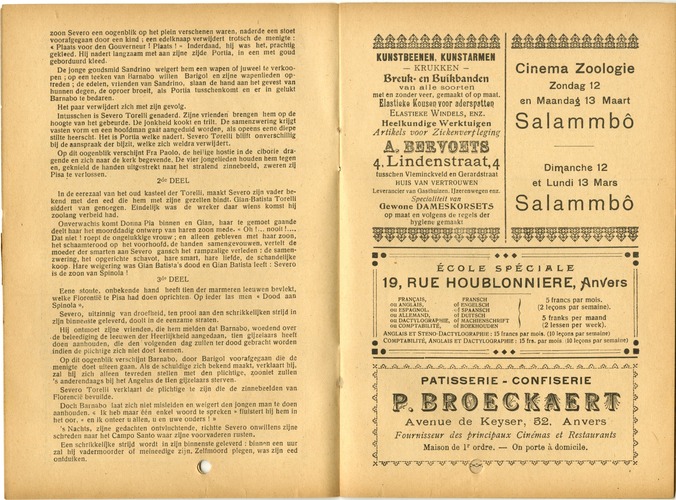 <5! Maison existant depuis 20 ans, Avenue de Keyser, 54. L BEZOEKT HET ßadtais i, pouillon 204, Dambruggestraat ANTWERPEN Een der schoonste en modernste bad-inrichtingen met centrale verwarming der plaats, met 27 Kabienen Des zomers open van 7 uren ’s morgens tot 8 uren ’s avonds des winters van 8 uren ’s morgens tot 7 uren ’s avonds Zon- en Feestdagen gesloten om 12 uren. Prijs 0.60 fr. - Per abon. 0.50 fr. Charbons /Vlph. MOERMAN I 29, Rue du Palais ANVERS (Sud) HORS DE TOUT SYNDICAT Firme fondée en 1896 Grande Spécialité de Charbons domestiques Grosse composition et qualité supérieure CHARBONS DE BOIS JJntfjracites, goulets ûvo/des COKES divers AOtÿtÿrV'', ZEEP IN POEDER J: H. DESCHAMPS - /\ntv\terpen. fieeren Rookers van Gigaretten vraagt aan uwen VVinkelier de CiQaret SUBLIME F. LES, firma SchWalbe j|WWW