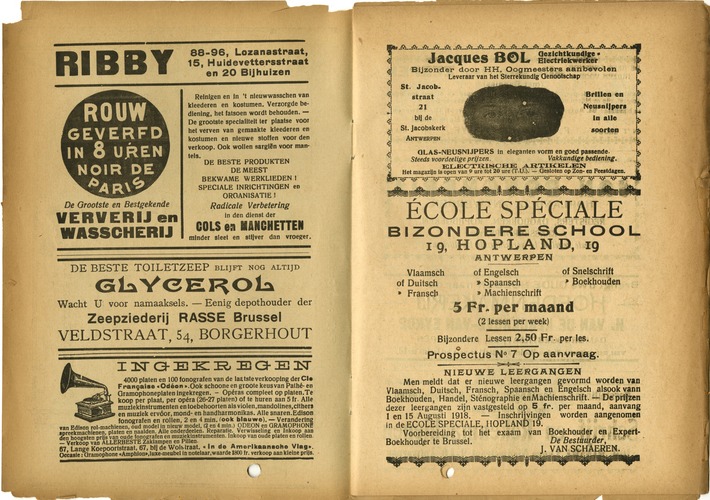 NIEUWE LEERGÄUGEN Men meldt dat er nieuwe leergangen gevormd worden van Vlaamsch, Duitsch, Fransch, Spaansch en Engelsch alsook vann Boekhouden, Handel, Sténographie enMachienschrift. — De prijzen dezer leergangen zijn vastgesteld op 5 fr. per maand, aanvang 1 en 15 Augusti 1918. — Inschrijvingen worden aangenomen