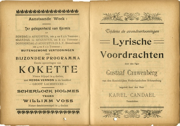 op Zondag 11 Augustus, om 4 en 8 1/2 torenuur Maandag 12 Augustus, om 8 1/2 torenuur Donderdag 15 Aug. (O.L.V.Hemelvaart)om 4en 81/2 t.u. Buitengewone Vertooningen